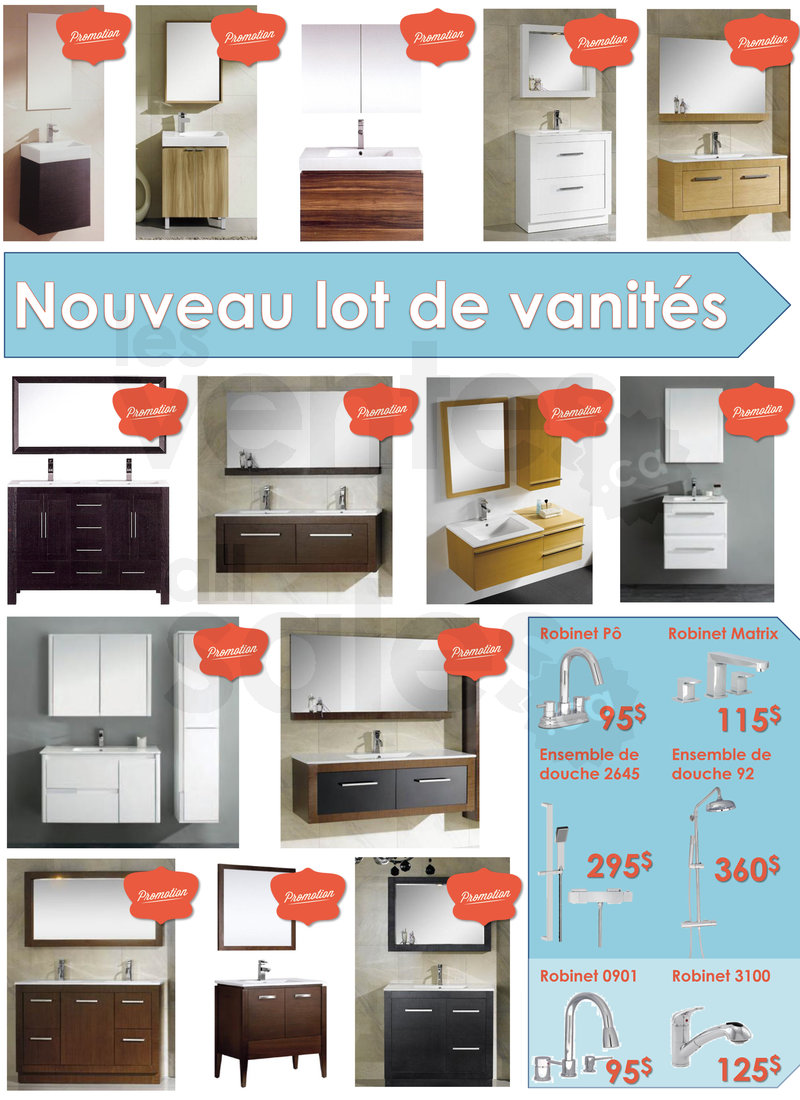 Venez voir notre nouveau lot de vanités en promotion pour vos rénovations de salle de bains. Nous avons aussi une sélection de robinetterie à partir de 95$ et ensembles de douche.