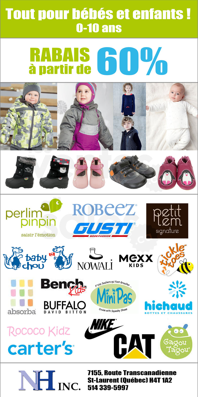 Trouvez de tout pour bébés et enfants chez NH Inc. Économisez à partir de 60% sur une sélection fantastique de marques connues dans les tailles nouveau-né à 10 ans. Profitez de rabais jusqu'à 75% durant notre liquidation de la mode hiver!