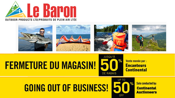 Grande vente de fermeture des magasins Le Baron. Dans les 4 magasins toute la marchandise doit être liquidée : Montréal, Ottawa, Mississauga, Markham. Rabais jusqu'à 50% sur vêtements, accessoires plein air, équipement de pêche, articles de camping.