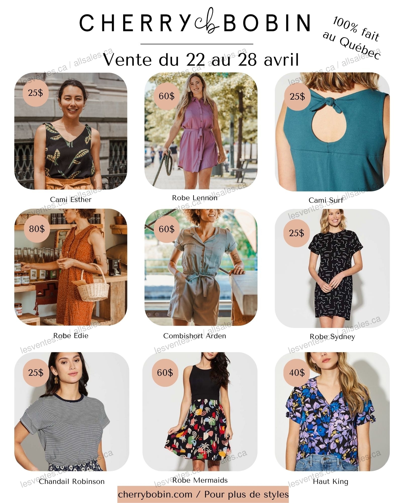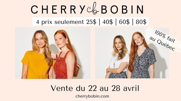 Grande vente sur les anciennes collections d'été du 22 au 28 avril. Quatre prix seulement: 25$ 40$ 60$ 80$. Cherry Bobin est une marque de prêt-à-porter pour femmes confectionnée au Québec avec des matériaux de qualité.