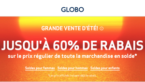 Grande vente d'été GLOBO! Jusqu'à 60% de RABAIS sur le prix régulier de toute la marchandise en solde* pour femmes, hommes et enfants.