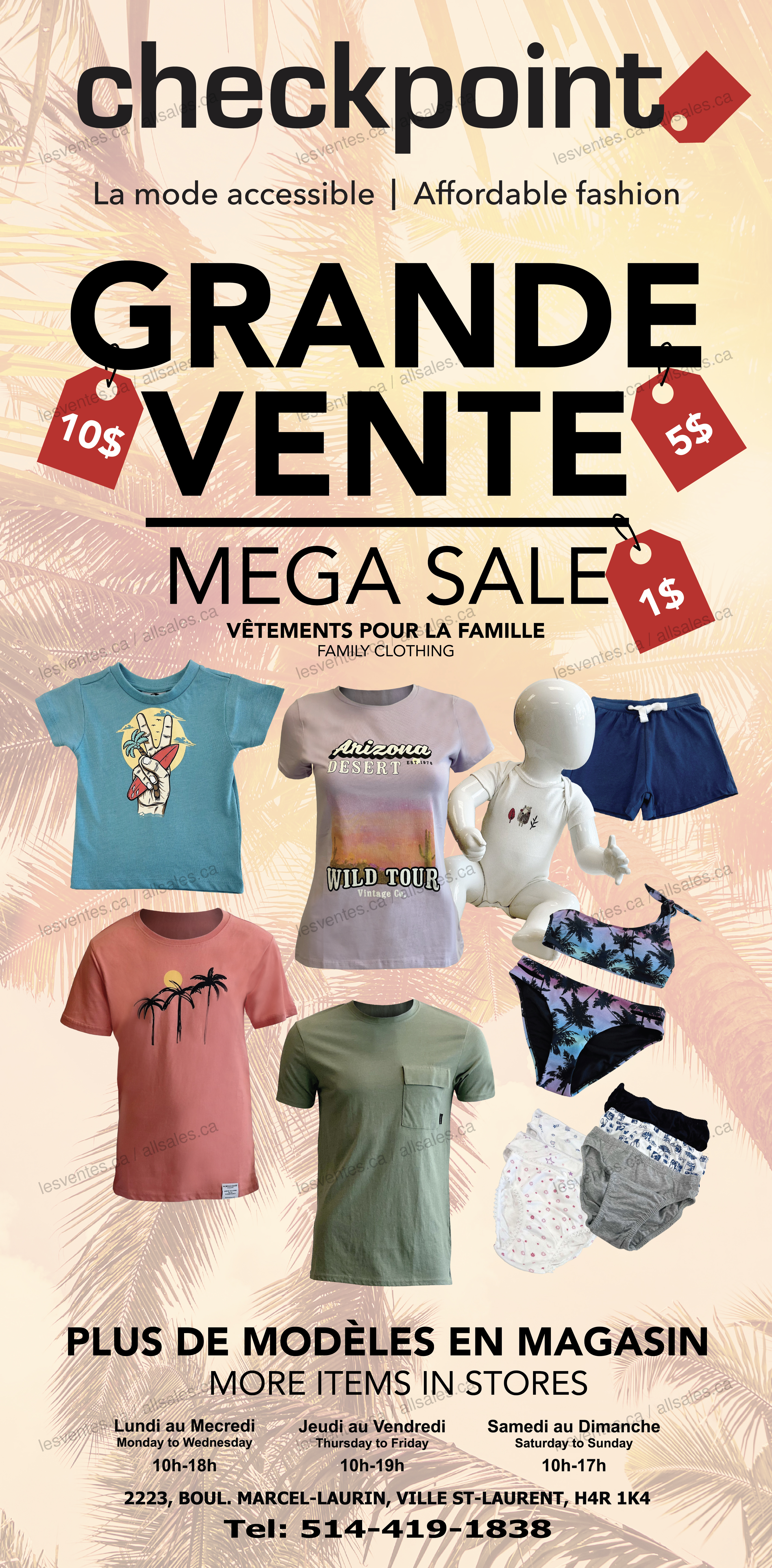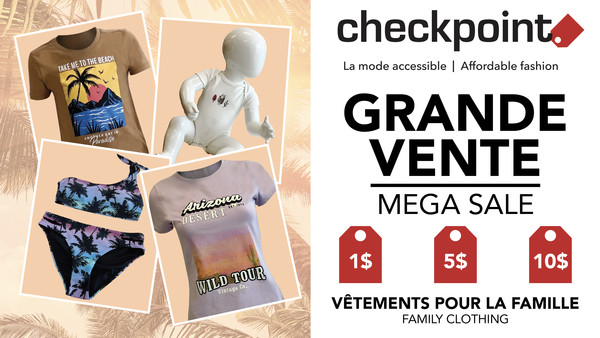 Méga vente au magasin familial Checkpoint! Profitez de nos prix exceptionnels sur des vêtements accessibles et durables! Une grande sélection de modèles entre 1 et 10$ en magasin. Ici pour vous et votre famille!