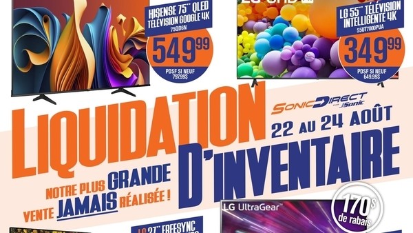 Gigantesque vente d'entrepôt Sonic Direct par J. Sonic du 22 au 24 août! NOTRE PLUS GRANDE VENTE JAMAIS RÉALISÉE! LG, Samsung, Dyson, Hisense, et plus. Écrans, téléviseurs, barre de son, aspirateurs, écouteurs et plus!