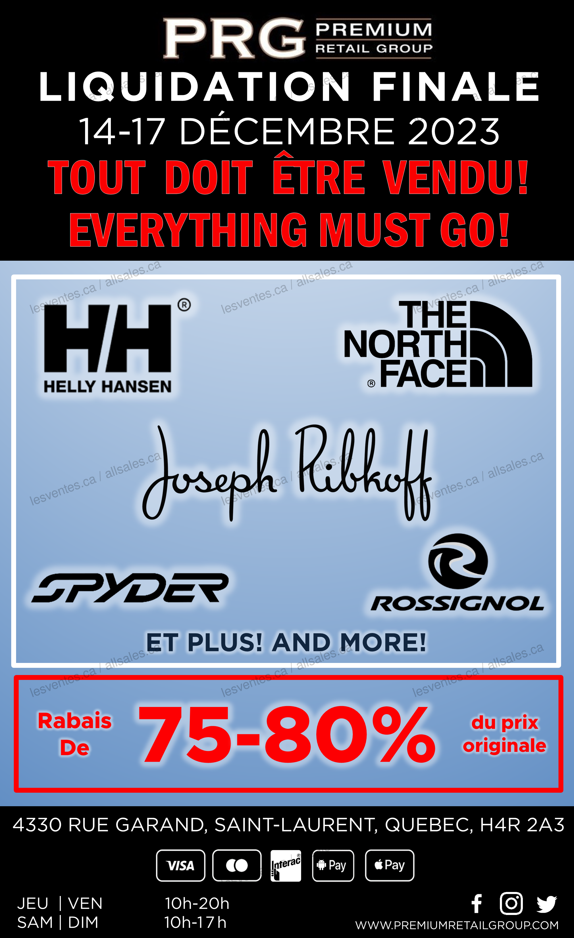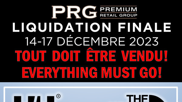 Grande liquidation du 14 au 17 décembre. Rabais de 75-80% sur HELLY HANSEN, THE NORTH FACE, JOSEPH RIBKOFF, SPYDER, ROSSIGNOL et plus! Hauts, pulls, pantalons, robes, manteaux d'hiver. Tout doit être vendu!