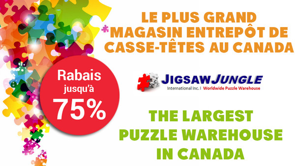 Magasinez chez Jigsaw Jungle, le plus grand entrepôt de casse-têtes au Canada! Rabais 10-75% du prix suggéré sur une foule de casse-têtes: Ravensburger, White Mountain, Heye, Educa, Trefl, Cobble Hill, Jumbo, etc.