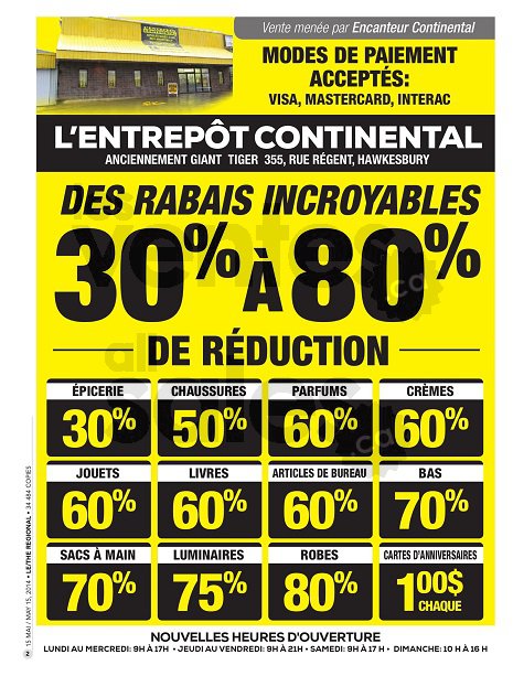 Des rabais incroyables! Tous nos prix sont coupés de 30 à 80%. Nouveaux arrivages chaque semaine. Marchandise de réclamations d’assurance, faillites et liquidations: épicerie, vêtements, souliers, sacs à main, articles de bureau, jouets, parfums et +