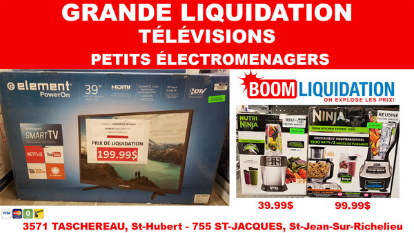 Liquidation de télévisions et petit électroménagers, boîtes ouvertes ou reconditionnés. Obtenez les meilleurs prix sur les téléviseurs de 24po à 55po. Marques : Samsung, LG, Vizio, Sanyo, Westinghouse, RCA, Cuisinart, Black & Decker, Ninja, Shark.