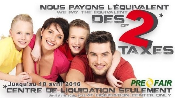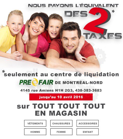 Jusqu'au 10 avril, nous payons l'équivalent des 2 taxes sur tout en magasin au centre de liquidation Prefair de Montréal-Nord seulement. Nous avons une grande variété de vêtements, chaussures, accessoires pour homme, femme & enfant à partir de 1,99$.