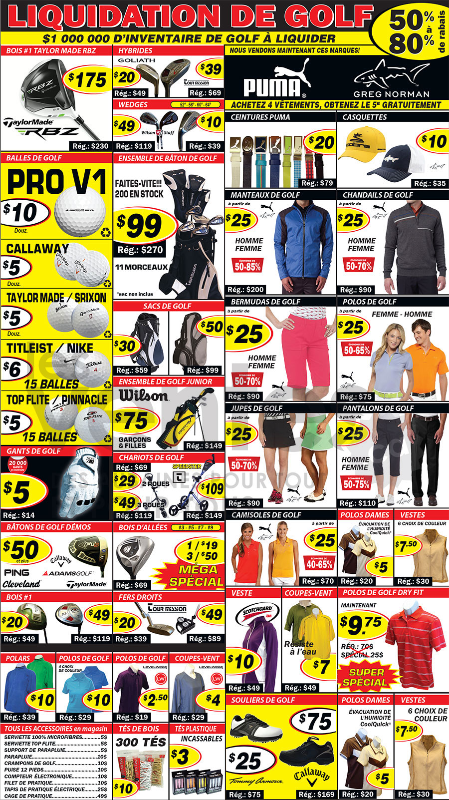 Méga liquidation de golf à La Prairie - 4 jours seulement! Vêtements, souliers, balles, bâtons, ensemble complets, sacs, accessoires et plus. Tout pour le golf à prix imbattable! Plus de 1 000 000$ d'inventaire à liquider. Économisez de 50% à 80% sur tout!