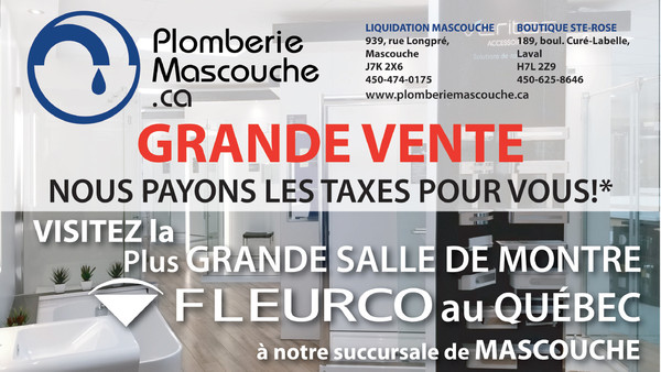 Vous avez des projets de rénovation de salle de bain? Ne manquez pas la grande vente de Plomberie Mascouche du 20 au 28 octobre 2018! Pour un temps limité seulement, nous payons les taxes pour vous*.