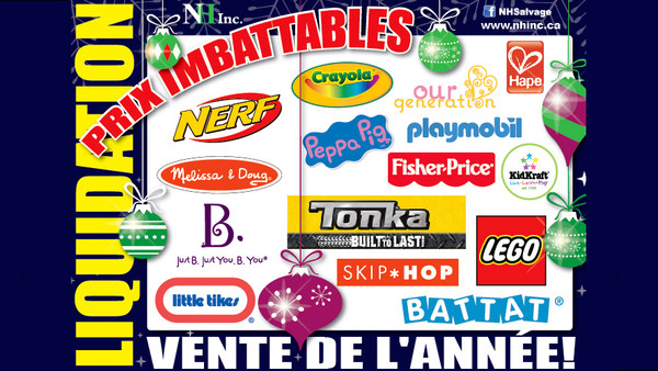 Débutez votre magasinage des Fêtes chez NH Salvage & profitez de la méga liquidation de jouets pour enfants! Toutes les marques connues sont au rendez-vous: Fisher-Price, LEGO, Tonka, Melissa & Doug, Playmobil, Nerf et plus à des prix imbattables!
