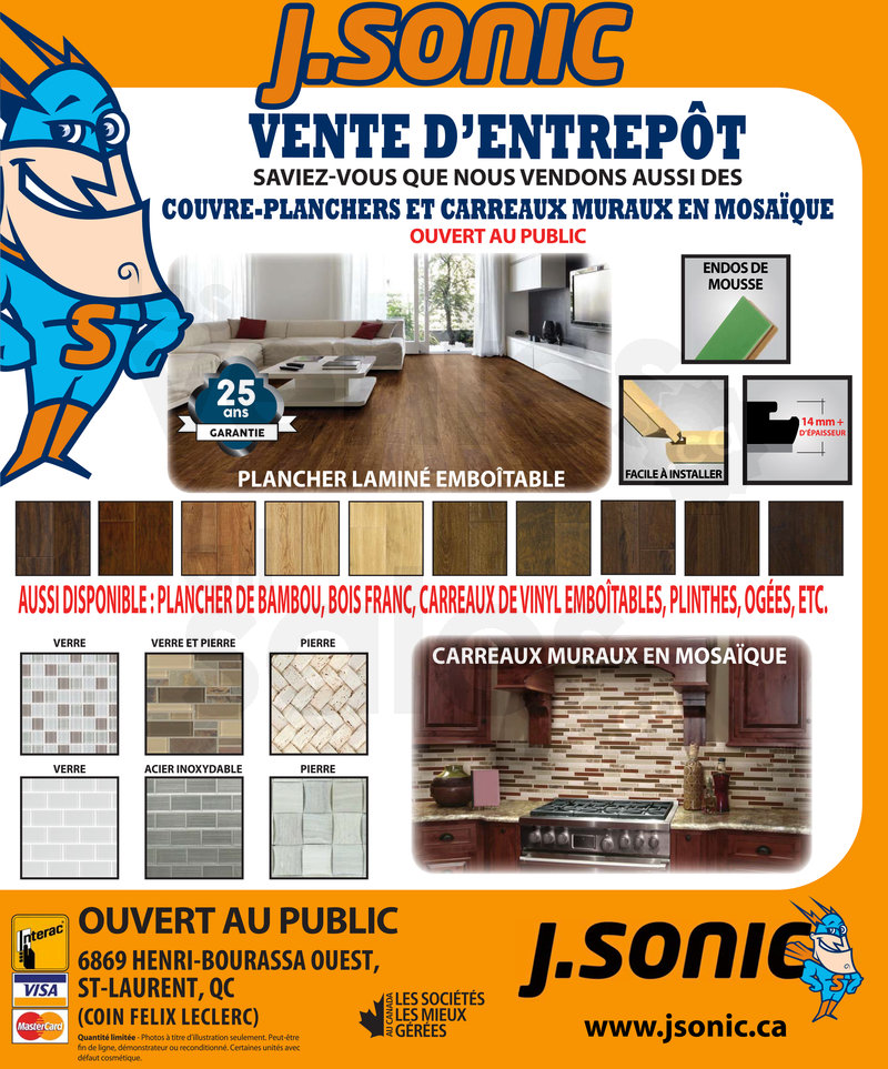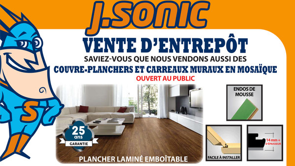 Vente d'entrepôt de couvre-planchers et carreaux muraux en mosaïque JSonic! Plancher laminé emboîtable, carreaux muraux en mosaïque, plancher de bambou, bois franc, carreaux de vinyle, plinthes et plus.
