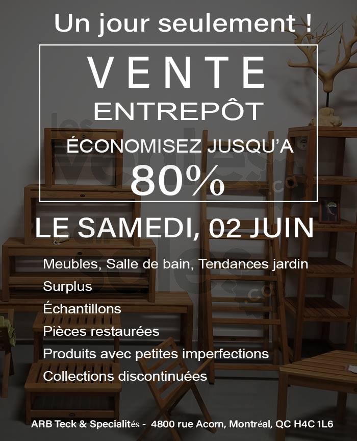 Méga vente d'entrepôt ARB Teak & Specialties le 2 juin, 2018 à Montréal! Économisez jusqu'à 80% de rabais sur les meubles, pièces restaurées, salle de bain, produit avec des imperfections, des collections discontinues et plus!