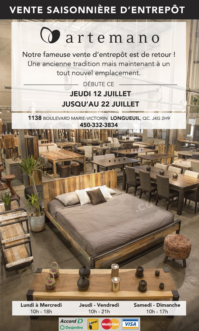 C'est le retour de la Grande vente d'entrepôt ARTEMANO du 12 au 22 juillet, 2018. Voilà une belle occasion d'apporter de l'exotique unique et fait à la main dans votre maison! C'est l'événement à ne pas manquer.