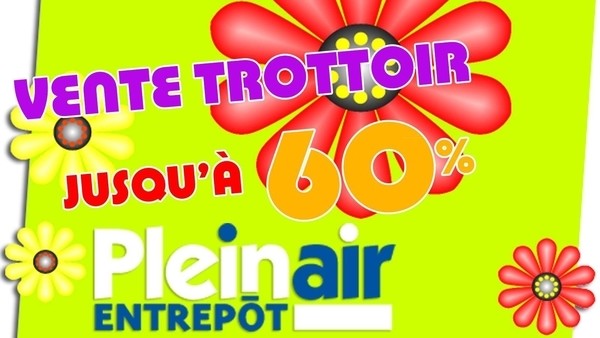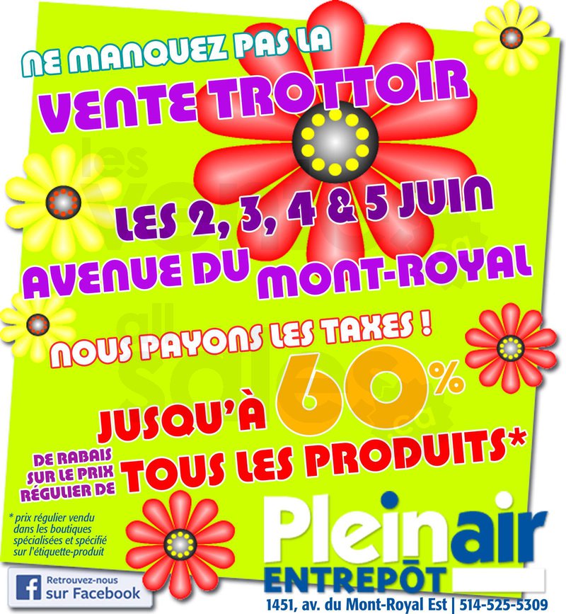 Ne manquez pas la vente trottoir les 2, 3, 4 et 5 juin, avenue du Mont-Royal. Obtenez jusqu'à 60% de rabais sur le prix régulier de tous les produits* chez Plein Air Entrepôt! De plus, vous obtenez un rabais équivalent aux taxes!