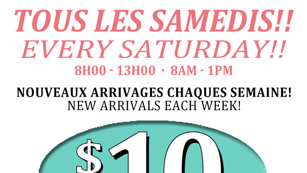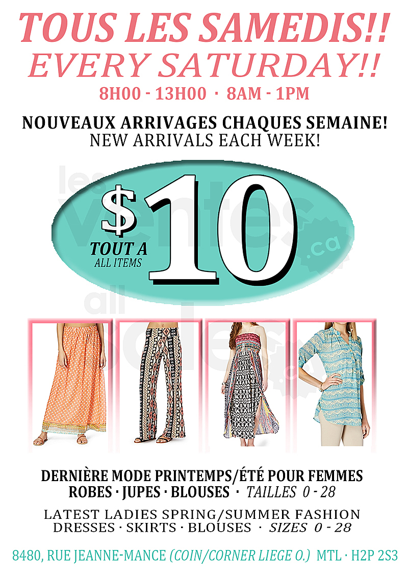 Ne manquez pas notre vente d'entrepôt! Seulement les samedis. Toute la marchandise est à 10$. De nouveaux arrivages à chaque semaine. Nous avons la dernière mode d'été pour femmes; blouses, robes, jupes. Tailles 0 à 28.