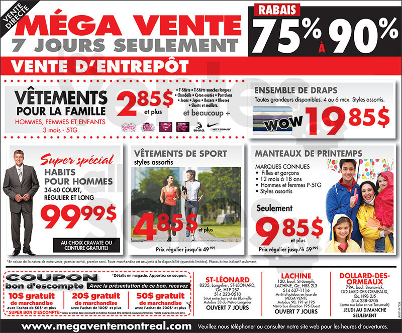 Chez Méga Vente d'Entrepôt, économisez de 75% à 90% sur des vêtements pour hommes, femmes, enfants et articles de maison! Vêtements à 2,85$ et plus, manteaux pour hommes, femmes et enfants à partir de 9,85$, ensembles de draps 4 ou 6 mcx 19,85$.