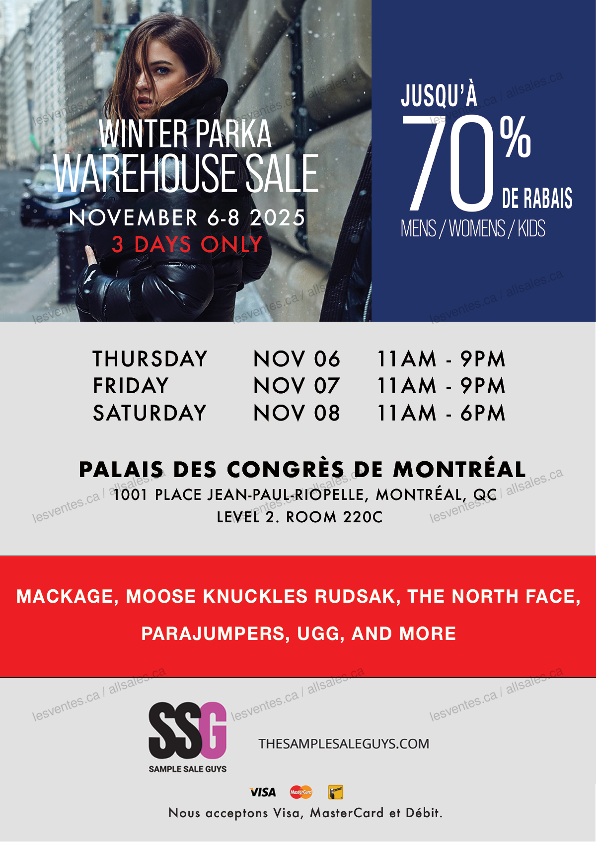 La vente de manteaux par Sample Sale Guys est de retour à Montréal du 6 au 8 novembre 2025. Grande sélection pour hommes, femmes & enfants! Rabais jusqu'à 70%, manteaux The North Face, Mackage, Moose Knuckles, Rudsak, Parajumpers +