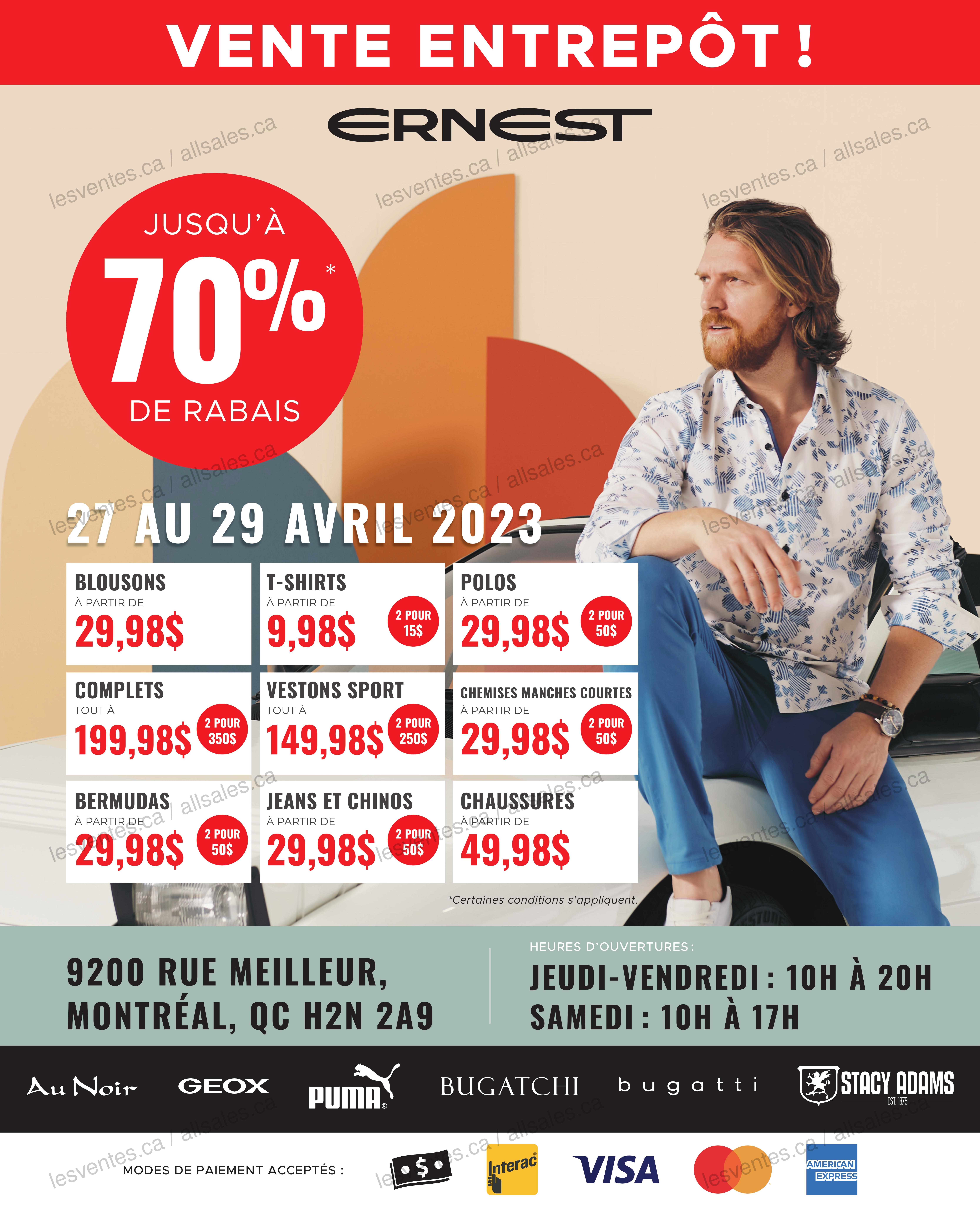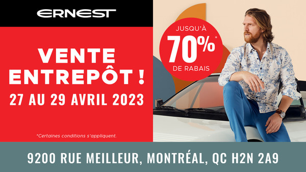 Du 27 au 29 avril aura lieu la MÉGA VENTE D’ENTREPÔT ERNEST. Jusqu’à 70% de rabais sur des complets, blousons, polos, chaussures et plus! Marques comme Au Noir, Geox, Puma, Bugatchi, Bugatti, Stacy Adams.