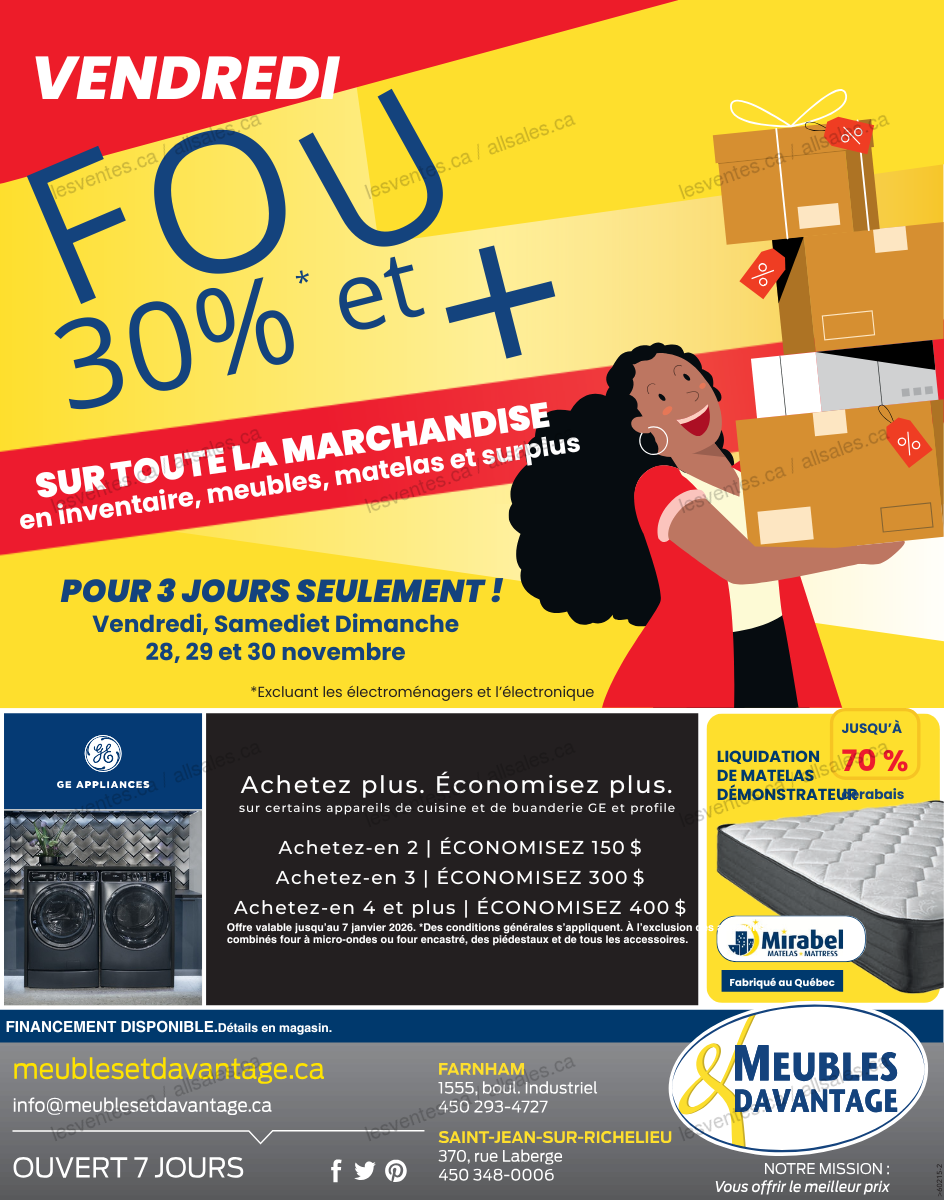 Du 28 au 30 novembre, profitez de 30% de rabais et plus* sur toute la marchandise en inventaire, meubles, matelas et plus*! Achetez plus et économisez plus sur certains appareils de cuisine et buanderie GE et profile.**