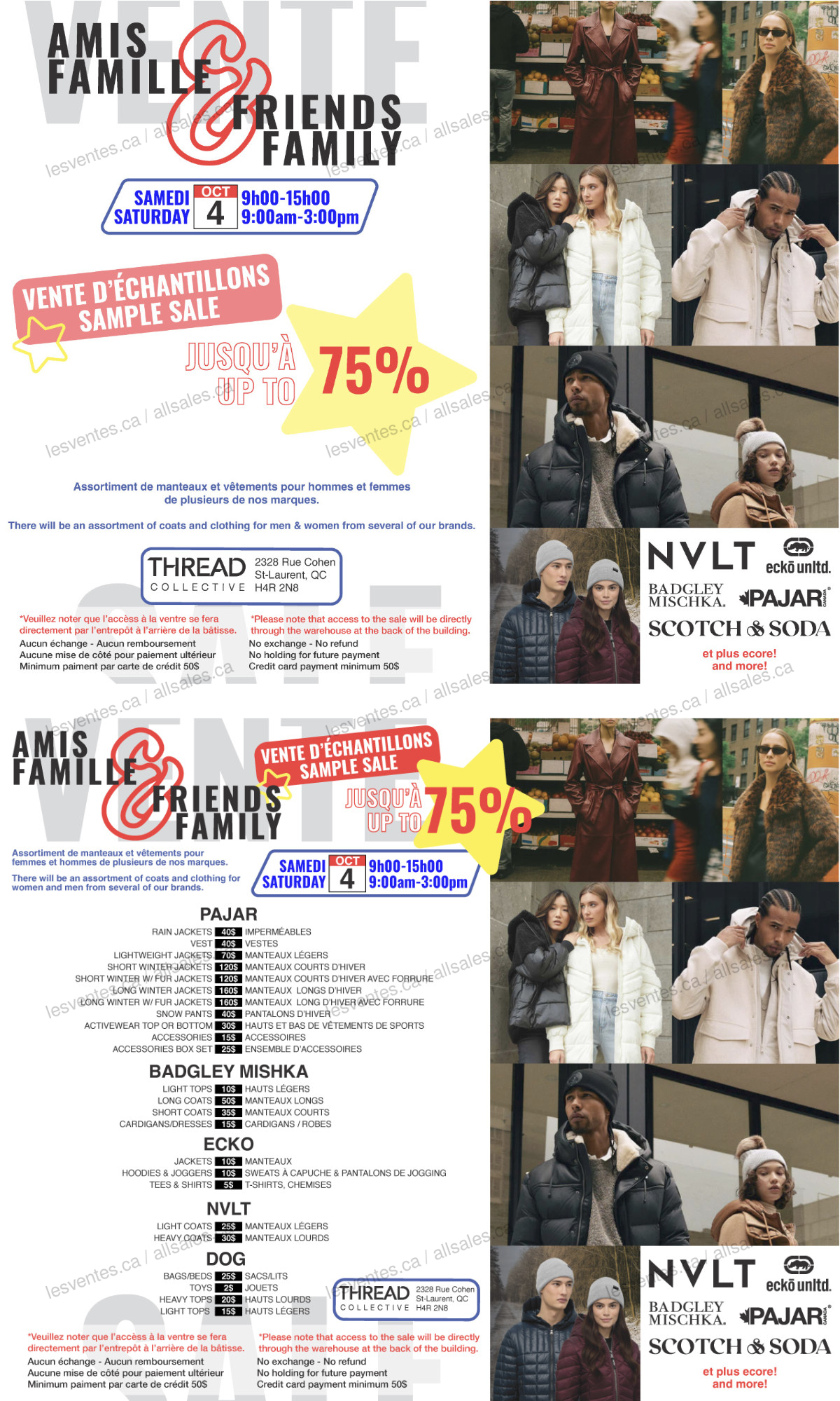Vente d'échantillons Thread Collective le samedi 4 octobre seulement! Jusqu'à 75% de rabais sur PAJAR, BADGLEY MISHKA, ECKO, NVLT, DOG et plus! Manteaux et vêtements pour hommes et femmes.