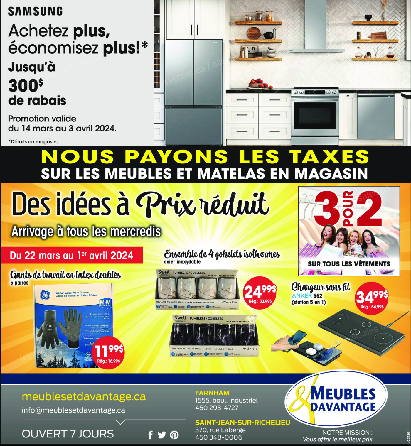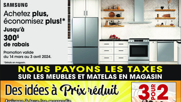 Promotion Samsung chez Meubles & Davantage; jusqu'à 300$ de rabais jusqu'au 3 avril!* Nous payons les taxes sur les meubles et matelas en magasin. 3 pour 2 sur tous les vêtements. Arrivage à tous les mercredis! *Détails en magasin