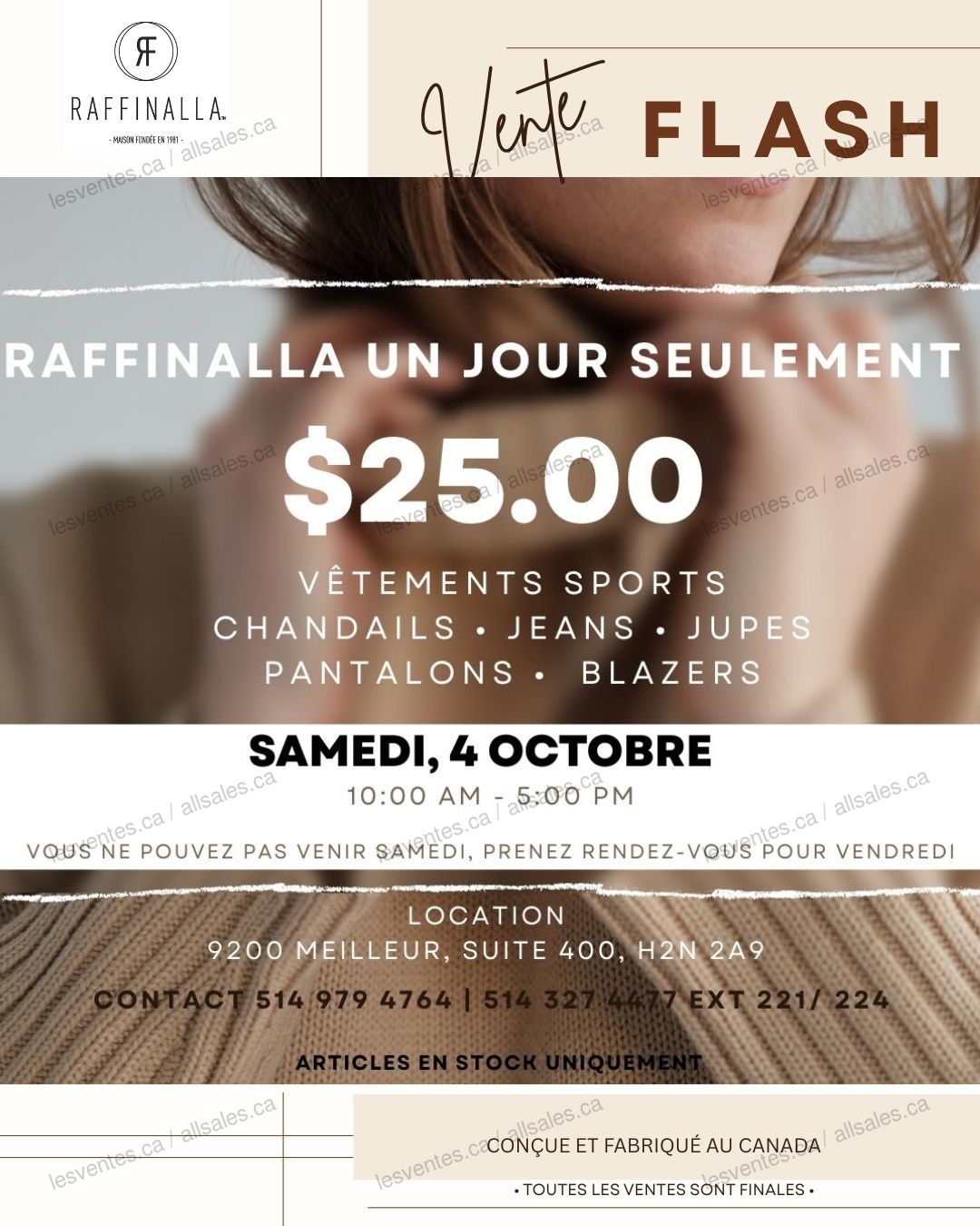 Vente flash à 25$. 1 jour seulement le 4 octobre. Faites le plein et économisez sur vos articles préférés en stock : pantalons, jeans, blazers, pulls, hauts, jupes et robes.