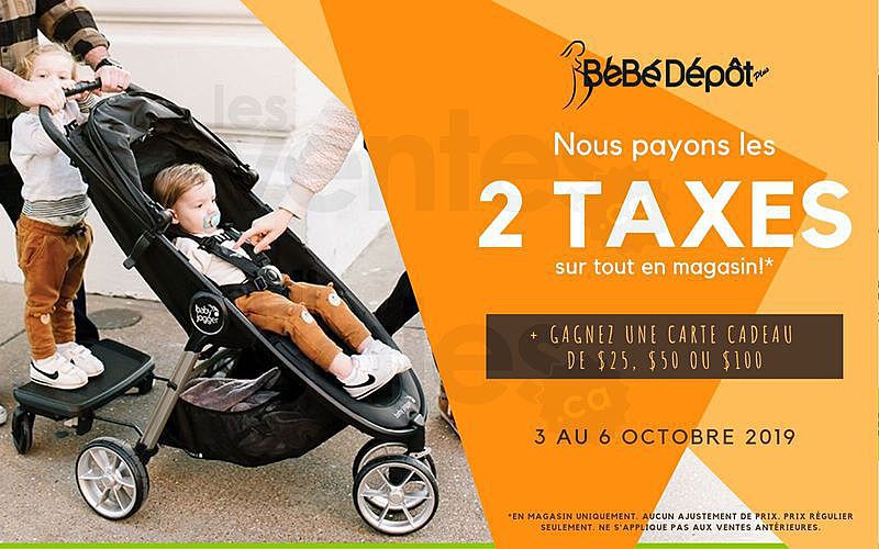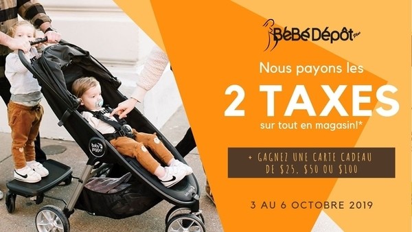Bébé Dépôt Plus vous accueille en grand lors de notre super vente d'octobre. Nous PAYONS les taxes sur tout en magasin! La Roue de Fortune BBD vous attend, venez la faire tourner pour courir la chance de gagner une carte-cadeau allant jusqu'à 100$