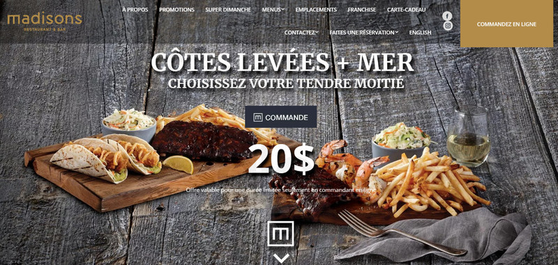 Découvrez le nouveau menu Madisons disponible en commande en ligne! Terre et mer, côtes levées, fruits de mer, burgers, menu d'enfants et plus encore.