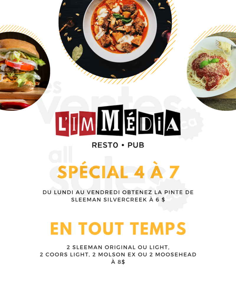 Profitez de diverses promotions sur l'alcool au Resto-Pub L'Immédia comme le spécial 4 à 7 du lundi au vendredi où la pinte de Sleeman Silvercreek est à 6$!