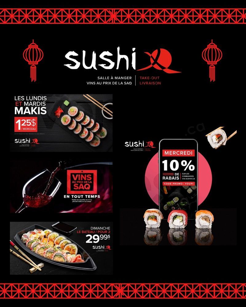NOUVELLE PROMO : Bateau de sushis pour 2 à seulement 29,99$ le dimanche! Sushi X vous offre aussi les meilleurs sushis à 1,25 $ le lundi et le mardi!