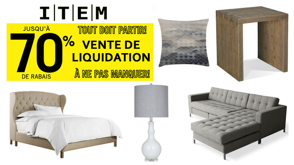 Grande vente de liquidation ITEM Décor à Boisbriand, jusqu'à 70% de rabais sur un vaste choix de meubles et accessoires haut de gamme. Tout doit partir! Faites-vite pour avoir le meilleur choix : lits, tables, lampes, coussins, articles de cuisine...