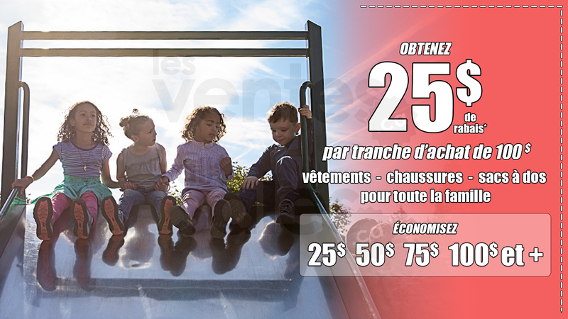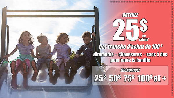 Obtenez 25$ de rabais par tranche de 100$.* Le rabais s’applique sur les vêtements prêts-à-porter, les vêtements athlétiques, les espadrilles, les chaussures de villes et les sacs à dos d'école à prix à régulier avant taxes.