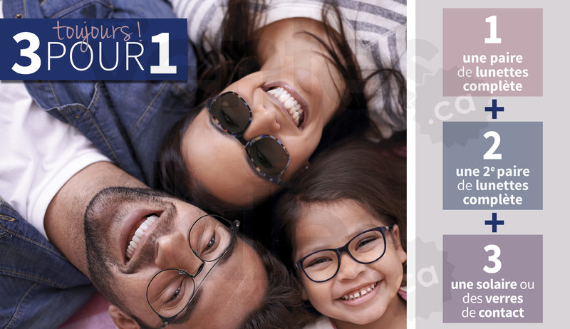 Le 3 pour 1 est toujours disponible chez les Lunetteries F. Farhat. Achetez un produit et obtenez-en deux autres gratuits. Oui oui, on a bien dit deux autres gratuits ! Tous les détails en ligne ou en succursale.