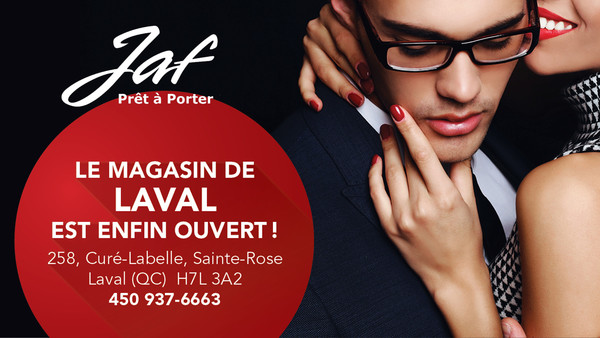 Le nouveau magasin Jaf Prêt-à-porter à Laval est maintenant ouvert! Nouvelle adresse sur le boulevard Curé-Labelle à Sainte-Rose. Spécial d'ouverture à ne pas manquer ; achetez un complet à 450$ ou 2 pour 750$, fait au Canada, tissu d'Italie.