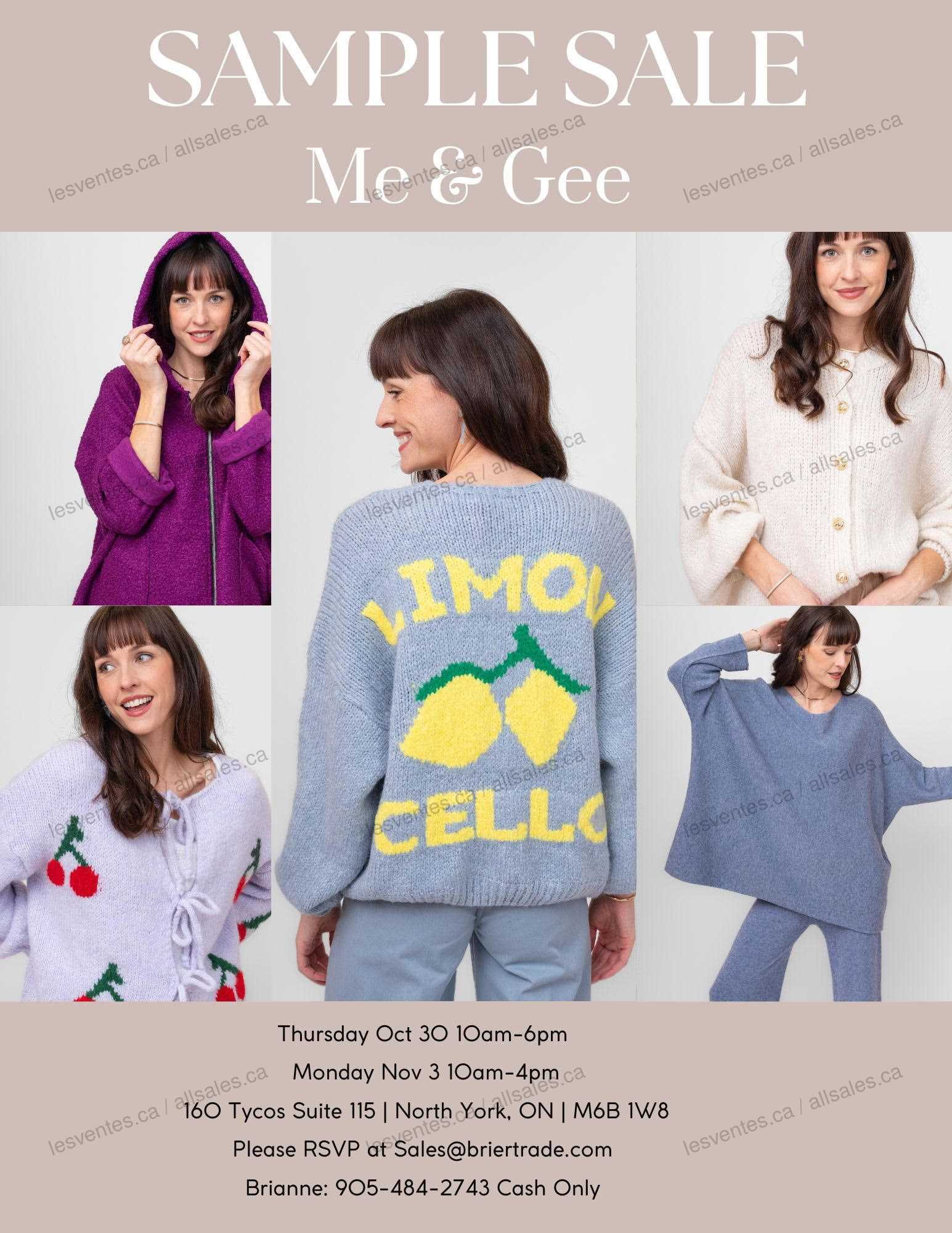 Vente d'échantillons Me & Gee à Toronto le 30 octobre et 3 novembre. Sélection de vêtements pour femmes conçus au Canada et fabriqués en Italie. Argent comptant seulement, vente finale. RSVP à sales@briertrade.com