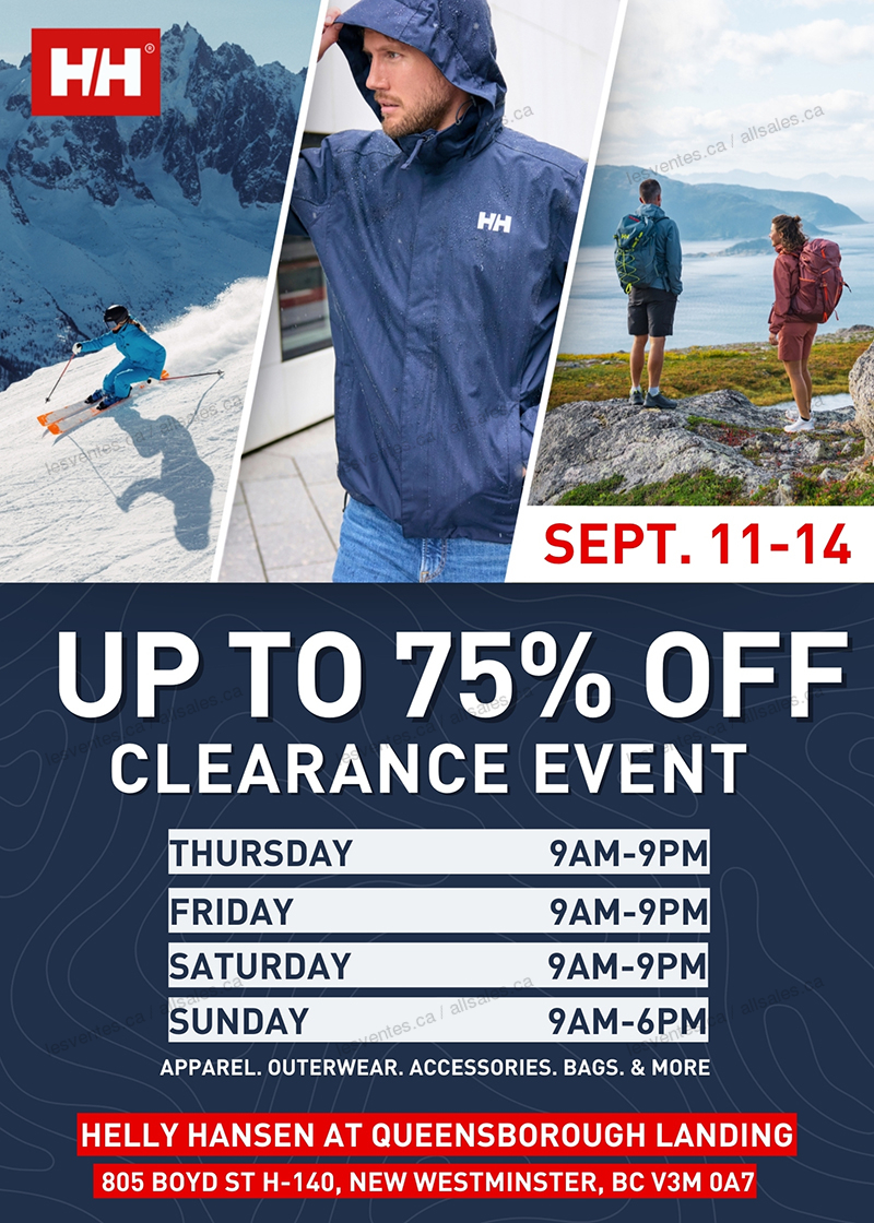 Du 11 au 14 septembre, magasinez au Helly Hansen Outlet et économisez jusqu'à 75% sur une vaste sélection de vêtements d'extérieur, vêtements de sport, articles d'hiver, chaussures, sacs et plus pour hommes, femmes et enfants.