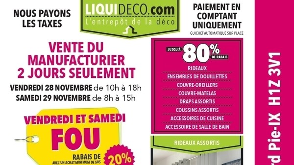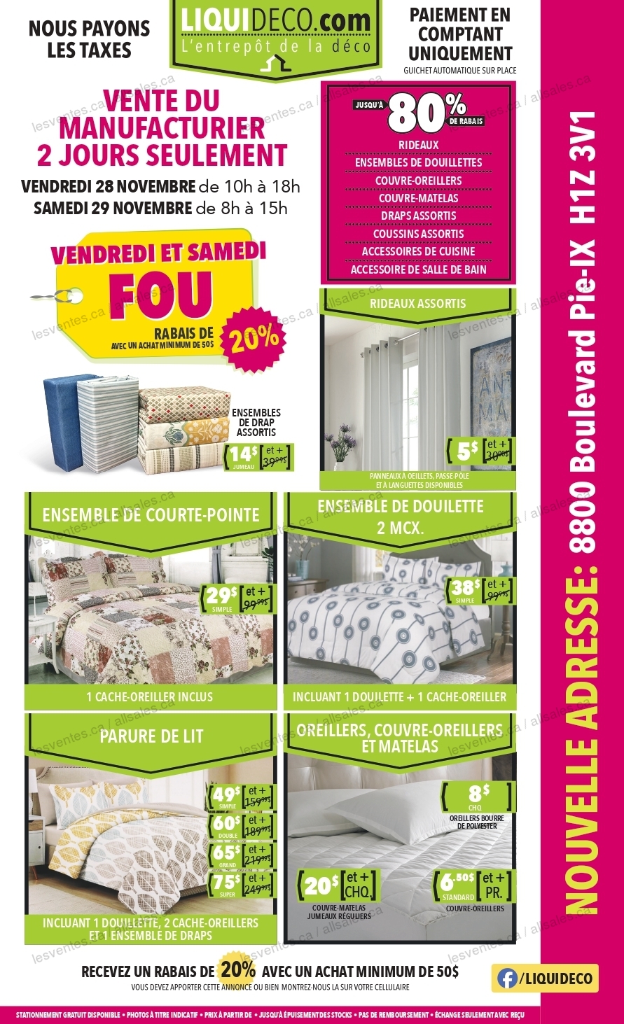 Vente du manufacturier - 2 jours seulement, les 28 et 29 novembre. Économisez jusqu'à 80% sur rideaux, ensembles de douillettes, couvre-oreillers, couvre-matelas, draps assortis, coussins, accessoires de cuisine & salle de bain.