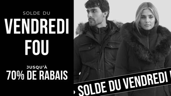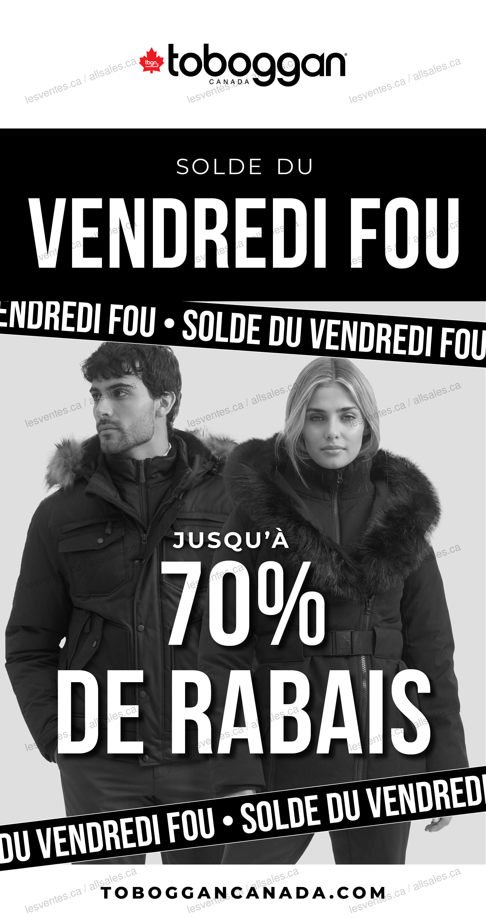 Dès le 28 novembre, c'est le Vendredi Fou en ligne sur Toboggan Canada. Jusqu'à 70% de rabais sur manteaux pour hommes et femmes. Vous ne voulez pas attendre? Visitez notre site dès aujourd'hui pour profiter de nos offres Pré-Vendredi fou!
