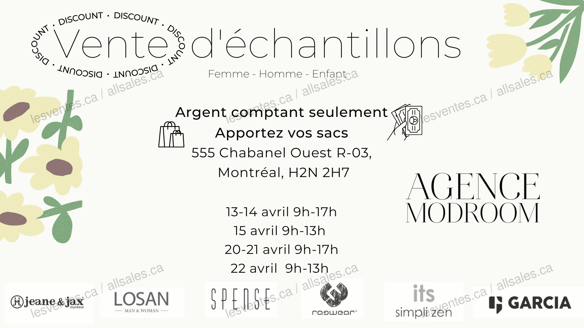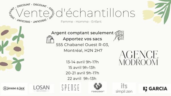 La vente d'échantillons par Agence ModRoom est de retour! Les 13-14-15, 20-21-22 avril, obtenez des offres incroyables sur des vêtements & accessoires de mode pour hommes, femmes & enfants. LOSAN, jeane & jax montreal, ragwear, GARCIA et plus.