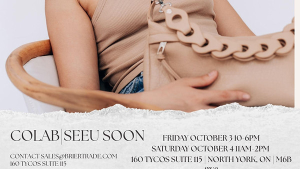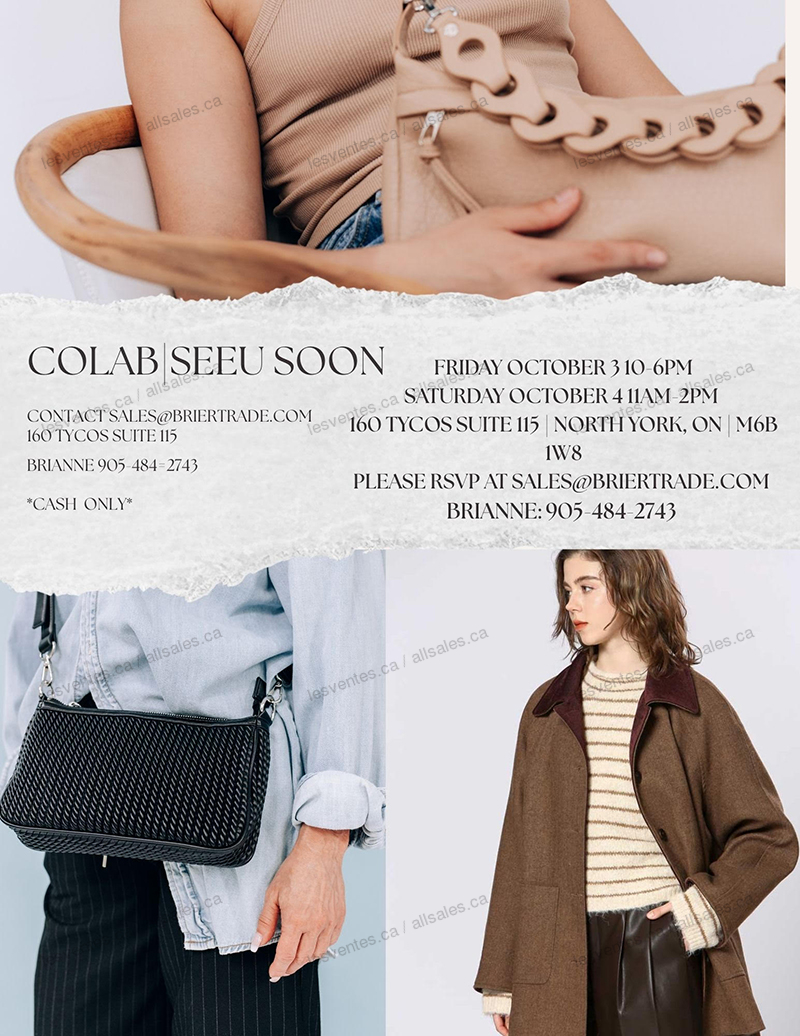 Vente d'échantillons CoLab & See U Soon à Toronto les 3 et 4 octobre. Sacs à main de marques en rabais! Prenez rendez-vous en envoyant un courriel à sales@briertrade.com. Argent comptant seulement.