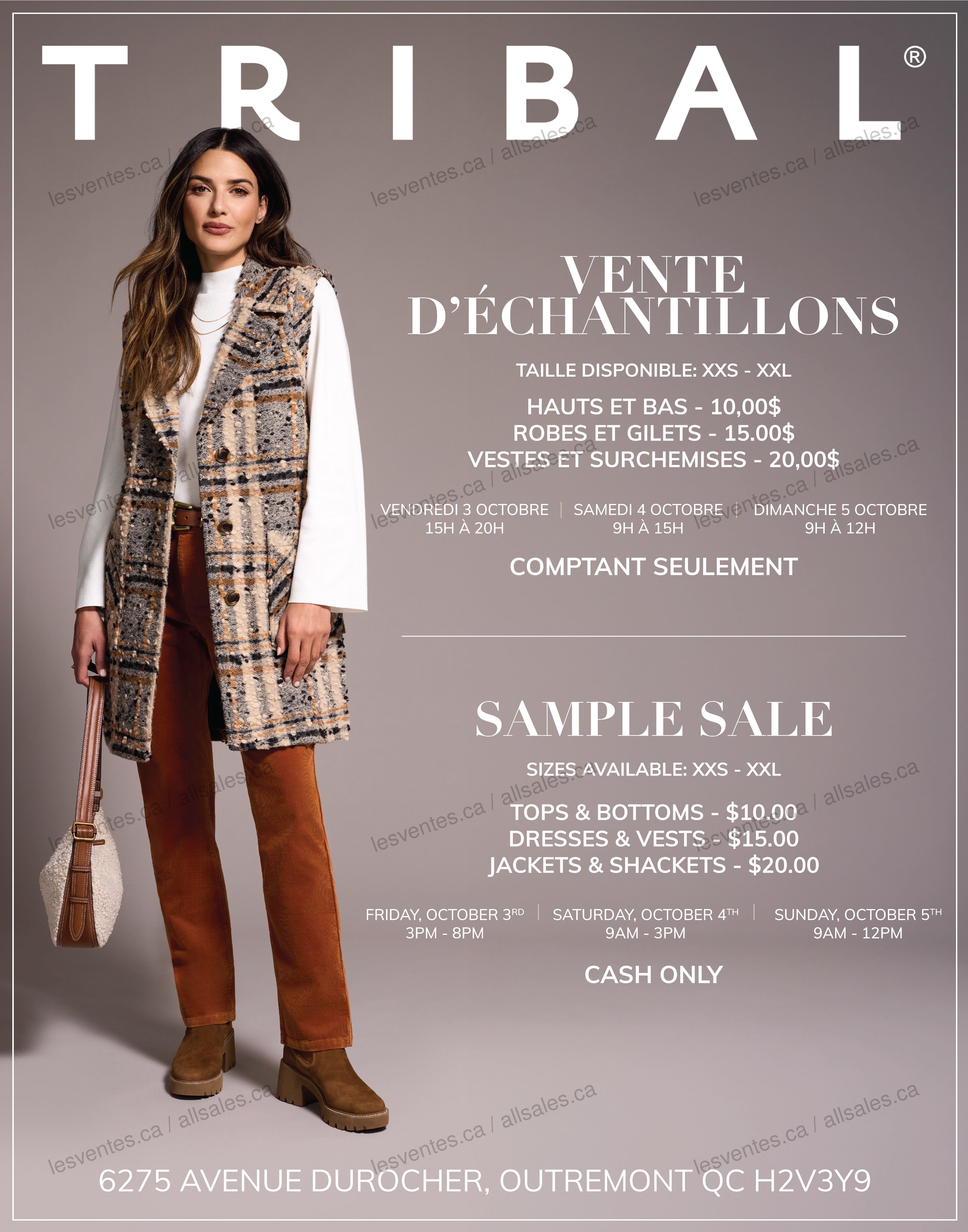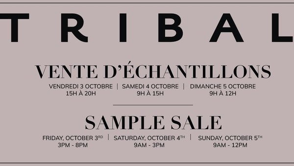Vente d'échantillons Tribal du 3 au 5 octobre 2025. Hauts et bas à 10$, robes et gilets à 15$, vestes de surchemises à 20$. Tailles disponibles: XXS à XXL. Argent comptant seulement.