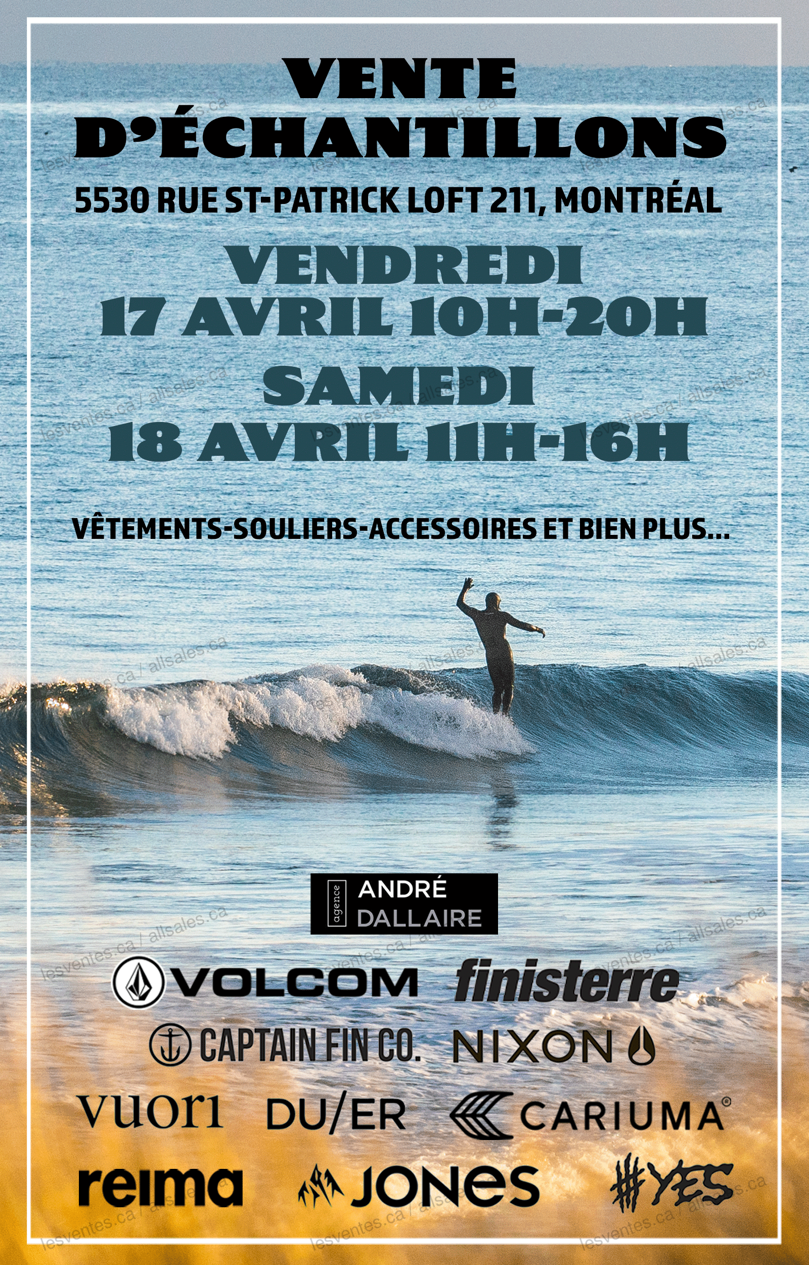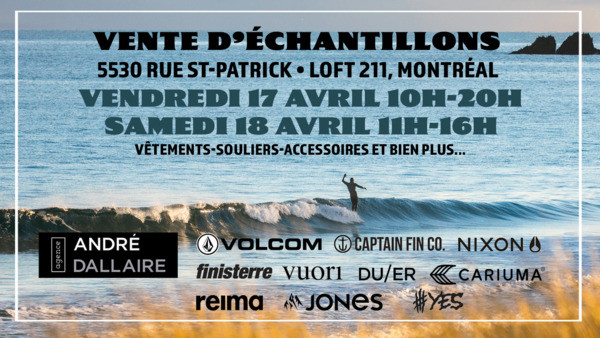 La vente d’échantillons de l’agence André Dallaire est à nos portes! Le vendredi 17 et samedi 18 avril prochain, venez économiser sur des marques telles que Volcom, Nixon, Vuori, Duer, Reima, Jones et plus! N’oubliez pas vos sacs réutilisables!
