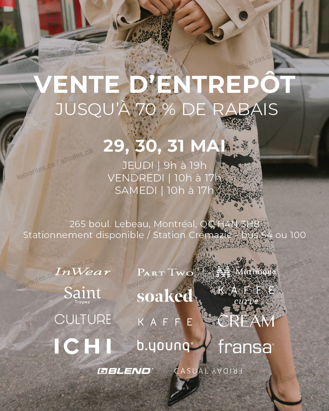 Vente d'entrepôt DK COMPANY - 3 jours seulement - les 29-30 et 31 mai 2025. Jusqu'à 70% de rabais. INWEAR, PART TWO, MATINIQUE, SAINT TROPEZ, SOAKED, CREAM, CULTURE, KAFFE, KAFFE CURVE, ICHI, B.YOUNG, FRANSA, BLEND, CASUAL FRIDAY.