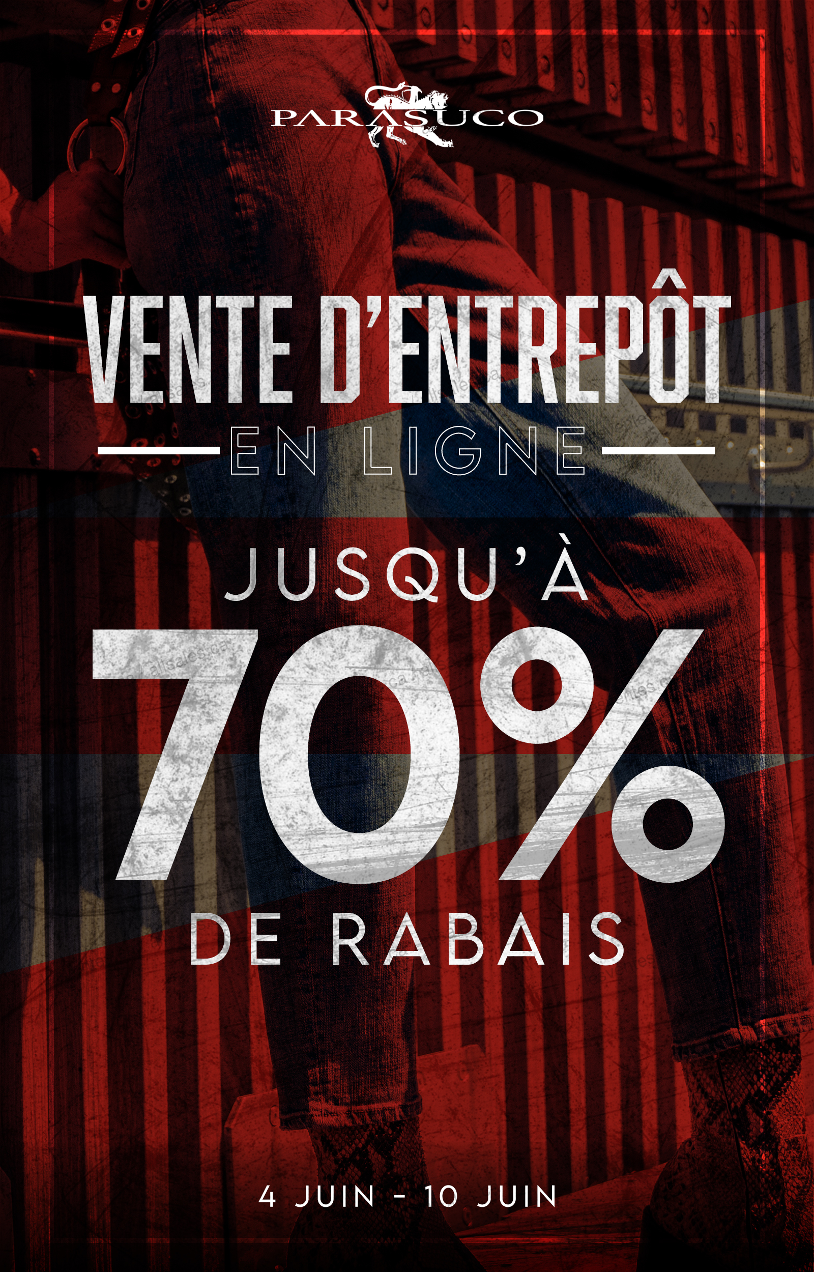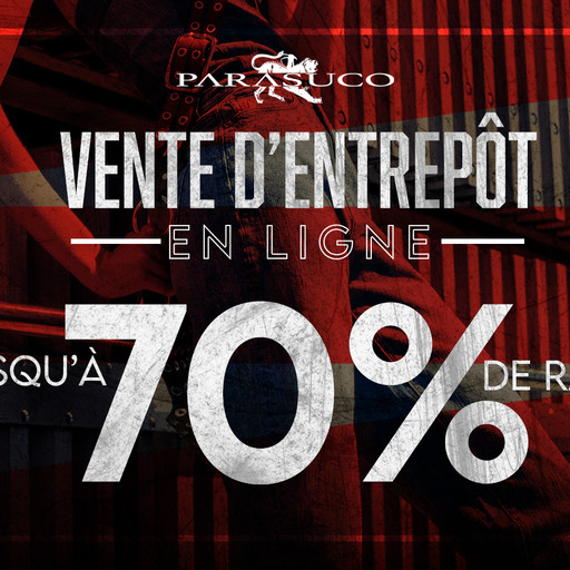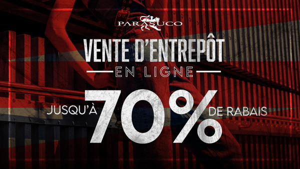 Vente d'entrepôt en ligne Parasuco Jeans! Jusqu'à 70% de rabais sur les chandails, jeans, jupes, hoodies, shorts et bien plus encore! Liquidations pour homme et pour femme! Tout est en bas de 35$. Tout est vente finale. Aucun retour/échange.