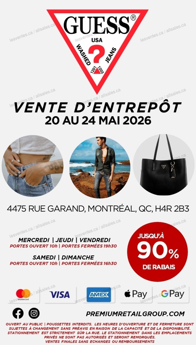 Nous vous invitons à la Vente d'Entrepôt GUESS? à Montréal du 20 au 24 mai! Grande sélection de jeans, robes, jupes, hauts, pantalons, manteaux et vestes jusqu'à 90% de rabais!