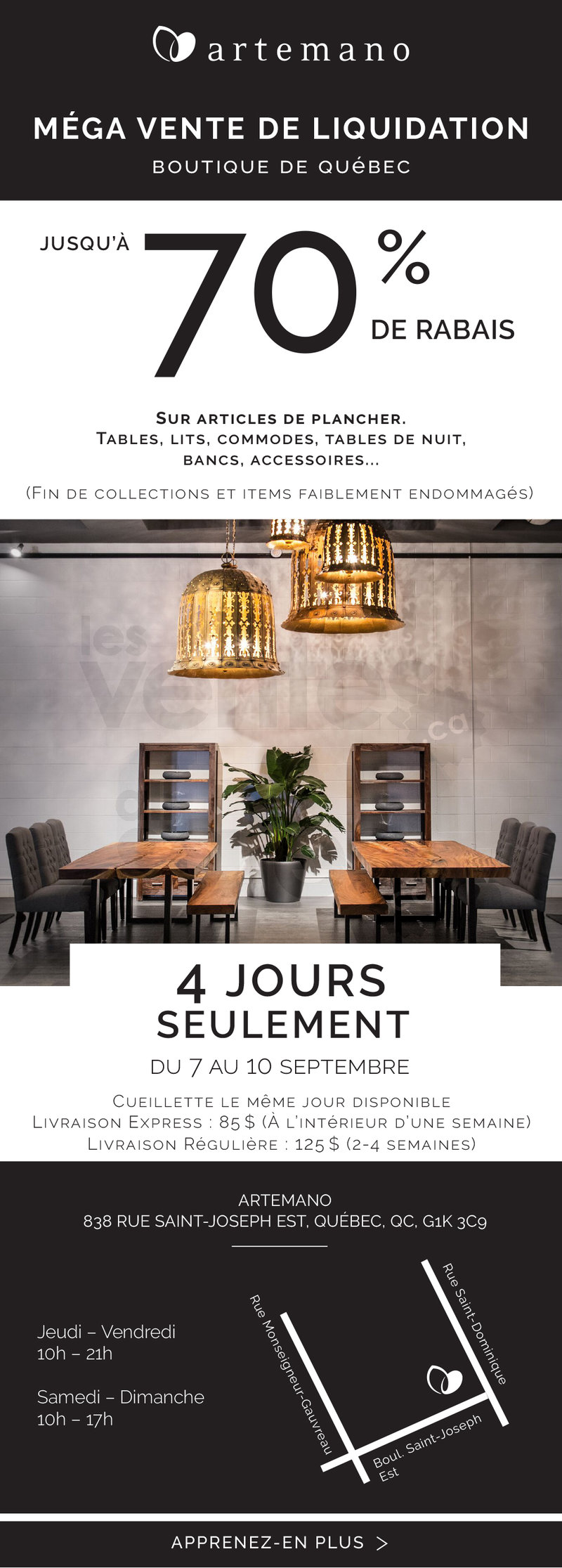 Méga vente de liquidation Artemano à la boutique de Québec du 7 au 10 septembre! Jusqu'à 70% de rabais sur articles de plancher, tables, lits, commodes, tables de nuit, bancs, accessoires.*