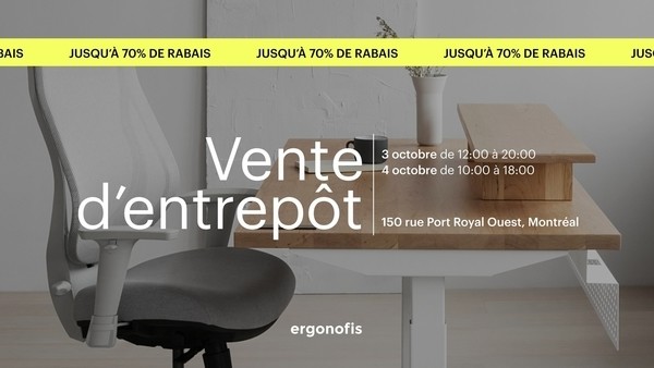 Grande vente d'entrepôt Ergonofis à Montréal les 3 et 4 octobre. Économisez jusqu’à 70% sur les bureaux ajustables, chaises ergonomiques et accessoires de bureau ⚡️