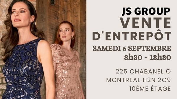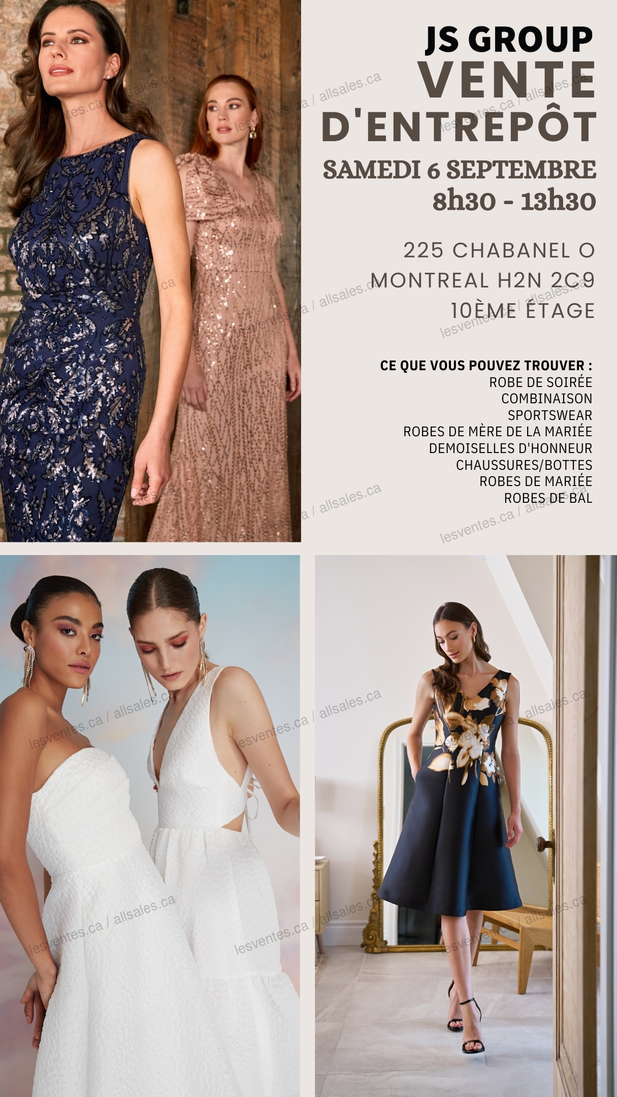 Vente d'entrepôt JS Group, 1 jour seulement, le samedi 6 septembre 2025! Découvrez nos collections designer à prix incroyables. Robes de soirée, mère de la mariée, robes de bal & sportswear.