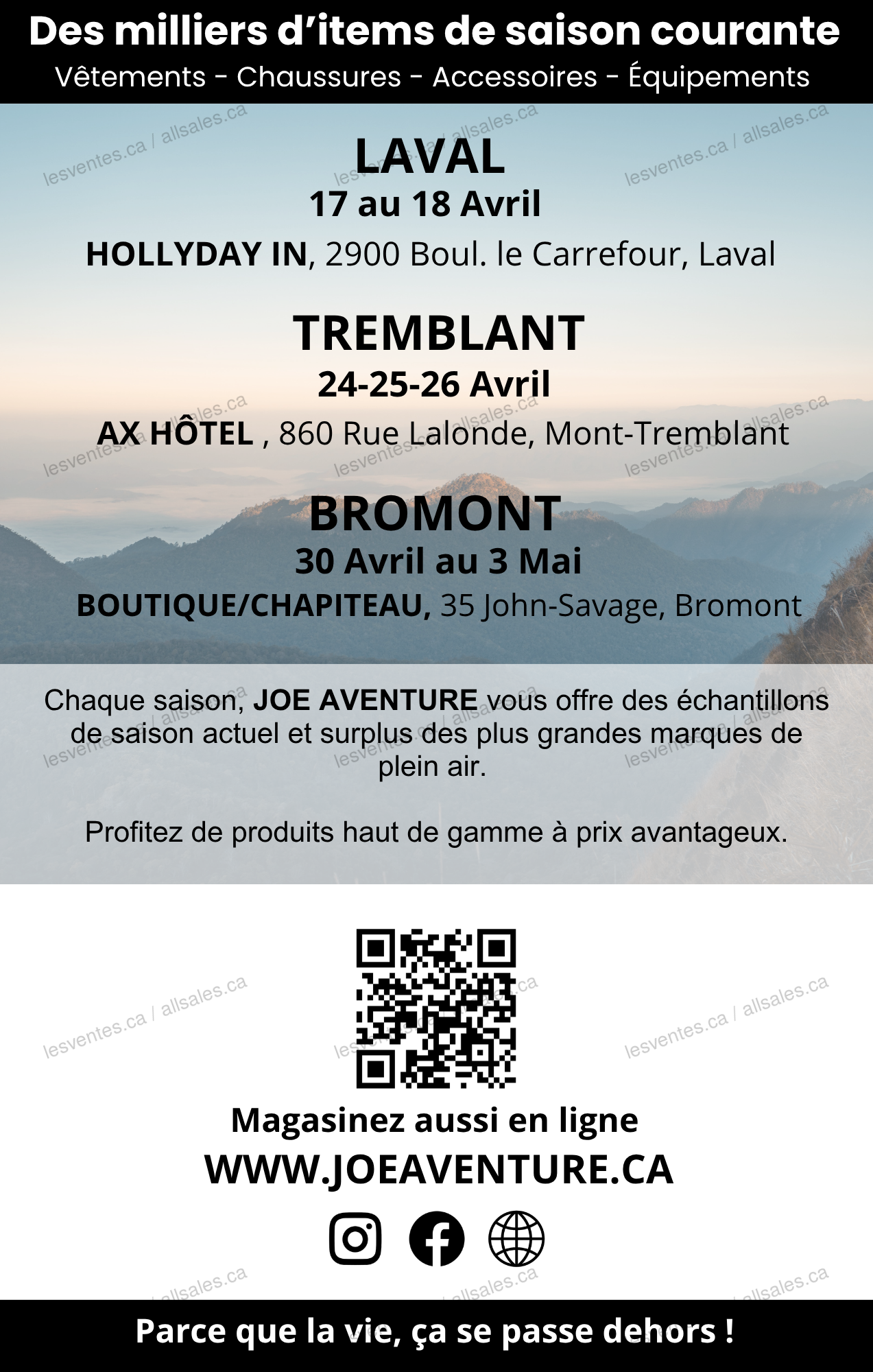 | Adresse | Joe Aventure - 35 Rue John-Savage, Local 202, Bromont (Québec) J2L 0A5 Canada